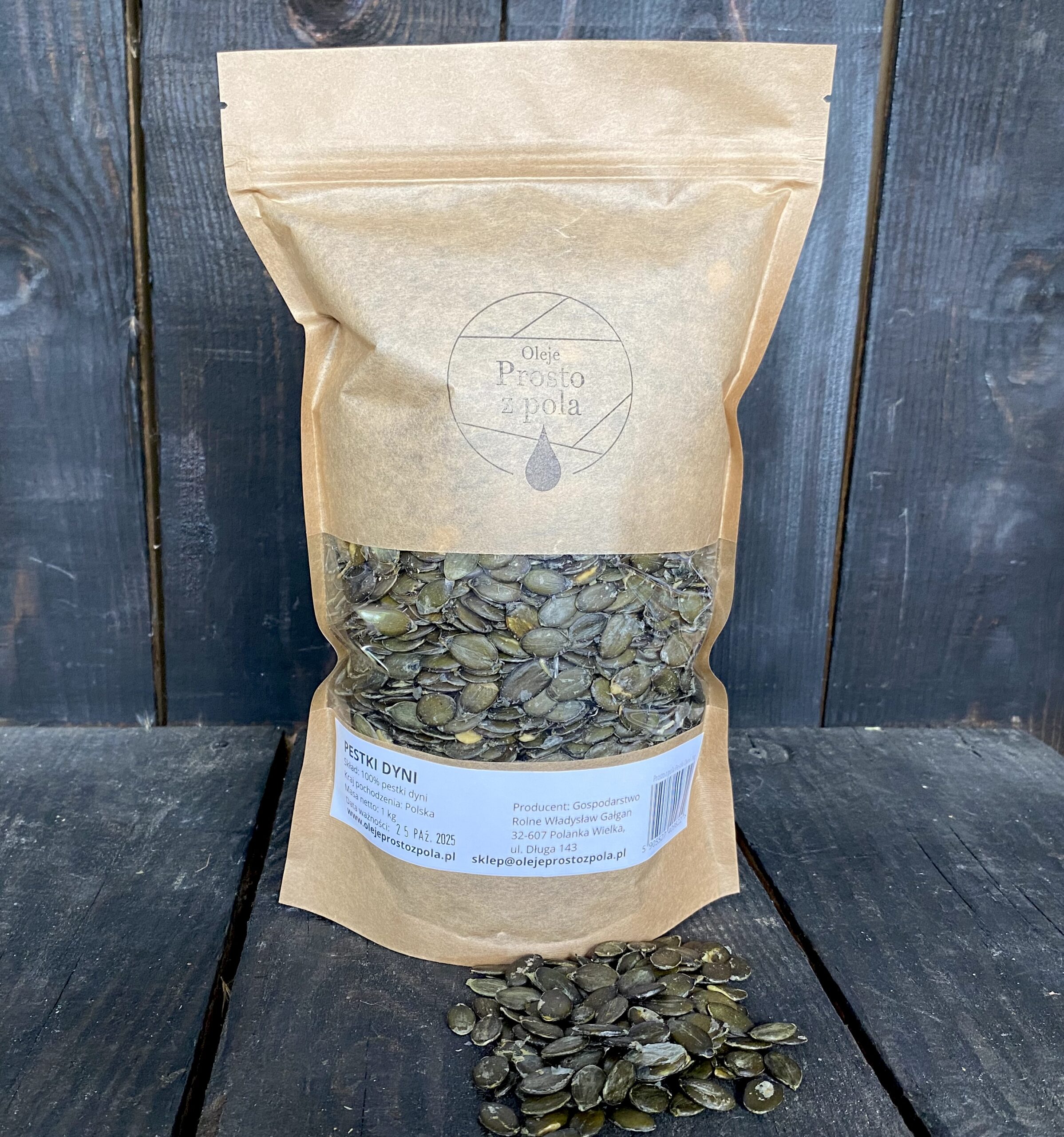 Pestki dyni bezłuskowej uprawianej w Polsce. Jej pestki są wyjątkowe w smaku, a dzięki swoim właściwościom stanowią mocno doceniany składnik kulinarny. Można je spożywać w formie surowej, prażonej, a także jako dodatek do niejednego dania. Staną się idealnym składnikiem poprawiającym nie tylko walory smakowe Twojej potrawy, ale i odżywcze!